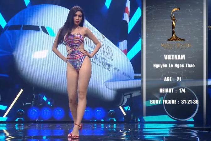 Mẫu đồ bơi màu kẻ sọc, có phần cut-out khoe vòng 2, kết hợp phần dây áo mảnh do ban tổ chức lựa chọn đã giúp tôn vóc dáng săn chắc và làn da trắng của Ngọc Thảo. Tuy nhiên, thiết kế trên vô tình khiến người đẹp Việt Nam vô tình để lộ nhược điểm hông hơi hẹp.