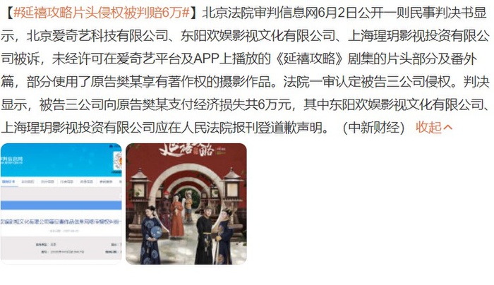Theo thông tin được đưa ra cho biết, trong phần giới thiệu đầu phim Diên Hi Công Lược phía nhà sản xuất đã tự ý sử dụng tác phẩm của người khác mà chưa nhận được sự cho phép. Sau quá trình kiểm tra, tòa án Bắc Kinh đã phán quyết phía công ty sản xuất dự án phim này phải bồi thường cho tác giả số tiền là 60.000 NDT (Khoảng hơn 200 triệu đồng).