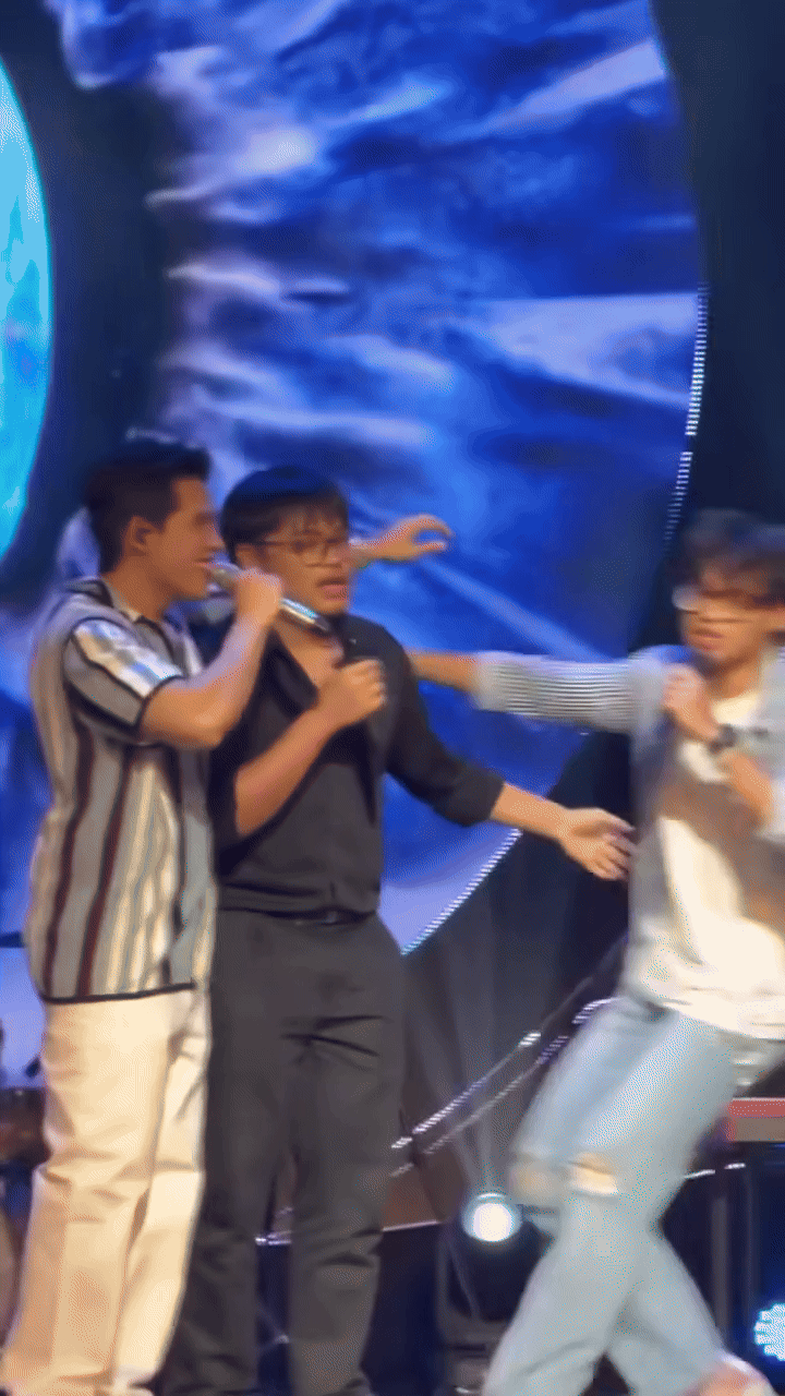 Yếu tố chiếm trọn spotlight màn tam ca này chắc chắn thuộc về Bi Béo. Mới còn nhõng nhẽo, phát cả rổ meme trong show ăn khách Bố Ơi, Mình Đi Đâu Thế, Bi Béo này đã trưởng thành hơn rất nhiều, ở cả ngoại hình, giọng nói đến cách ăn mặc. Hát là phụ, tấu hài là chính, cậu không chỉ ngân nga ca khúc Xin Đừng Lặng Im mà còn phiêu theo giai điệu, nhún nhảy cực “bánh dẻo” khiến khán giả muốn cười “bể bụng”. Khúc nào cao quá thì Bi Béo nhường lại ánh sáng cho Quốc Thiên.