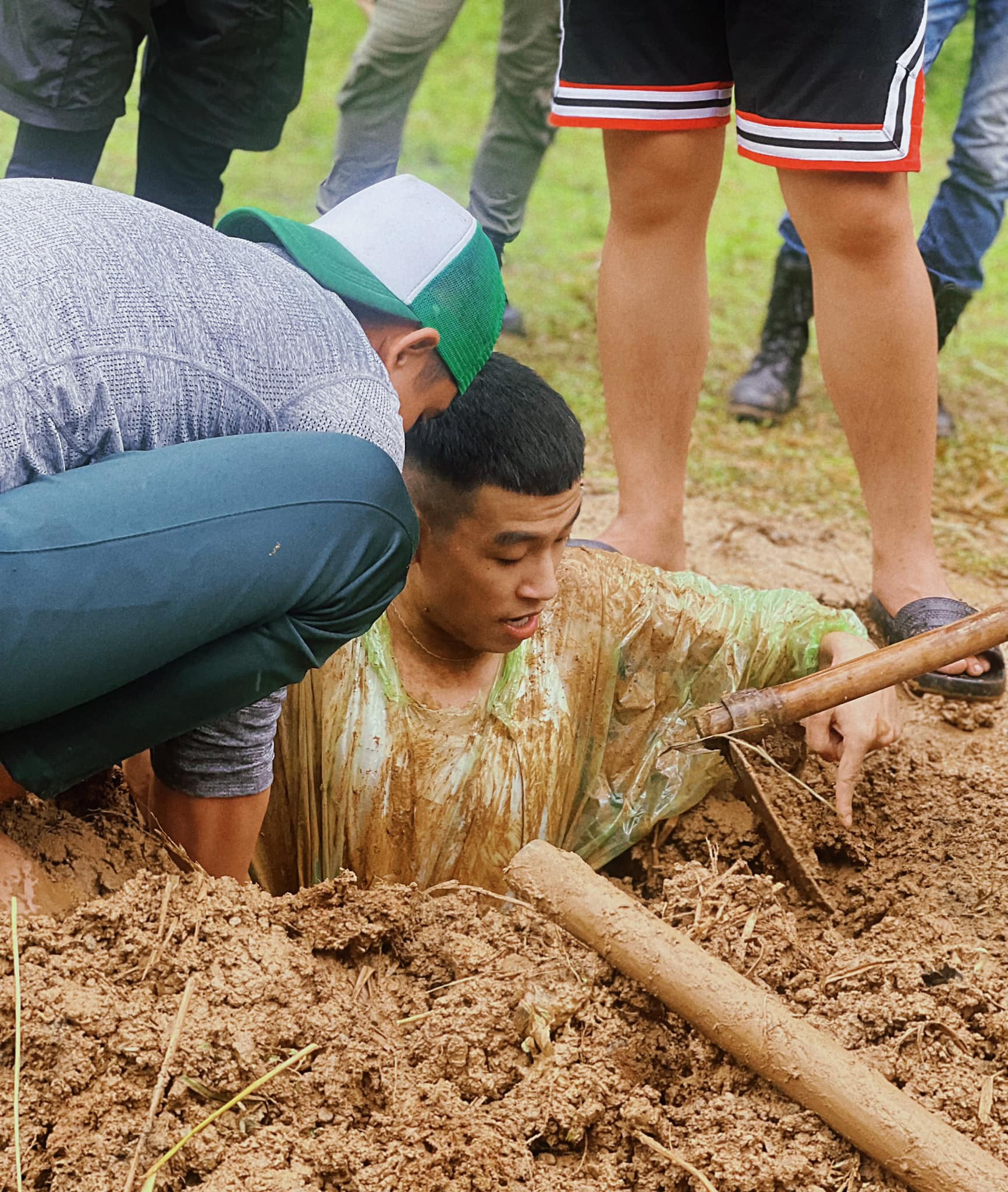 Khi đi đến bối cảnh, tổ thiết kế đã dầm mưa đào sẵn một cái hố vừa đủ cho diễn viên ngồi xuống. Để tránh mất thời gian của ê-kíp nên Tuấn Anh đề xuất lấp đất trực tiếp lên người. Mọi người đã phủ rơm để đệm lót xung quanh người cũng như mặc áo mưa nhằm giữ ấm cho Tuấn Anh".