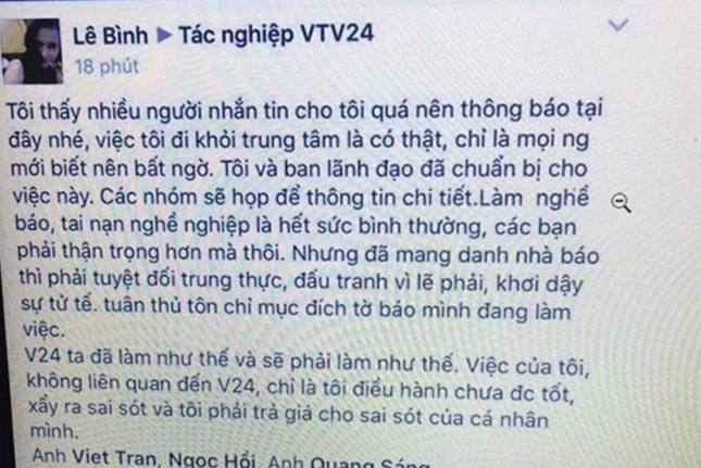 Cùng ngày trên mạng xã hội cũng lan truyền thông tin, hình ảnh bà Bình đăng trên nhóm kín trên Facebook của VTV24 về việc bà sẽ rời trung tâm này.