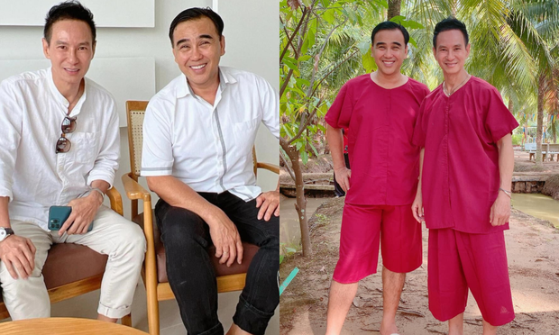 MC Quyền Linh, Trường Giang là 2 trong số hàng trăm khách mời xuất hiện tại sự kiện của vợ chồng Lý Hải - Minh Hà diễn ra tối 25/4. Khác với mọi khi, trong lần lộ diện đặc biệt này Trường Giang đích thân mang hoa và còn trao cái ôm thân thiết dành cho đàn anh. Quyền Linh hào hứng livestream suốt cả thảm đỏ, nam MC vui vẻ ra mặt khi hội ngộ Lý Hải.