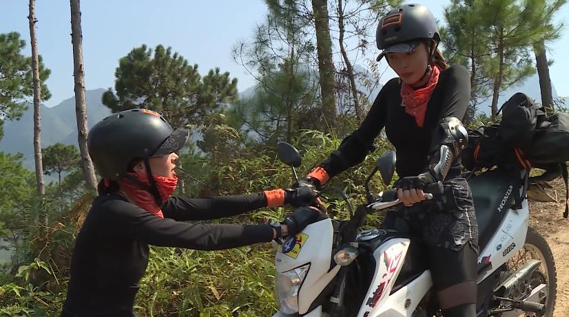 Đến thử thách chạy mô-tô địa hình, khi chứng kiến đoạn đường dốc và gồ ghề trước mặt, Kỳ Duyên đã bật khóc dù Minh Triệu vẫn luôn bên cạnh và hết lòng động viên: "Hôm qua còn mới leo vách núi được, cái này không cao hơn vách núi".
