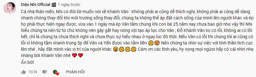 Diệu Nhi bênh vực Khánh Vân: "Cả nhà thân mến, Nhi có đôi lời muốn nói về Khánh Vân : Không phải ai cũng dễ thích nghi, không phải ai cũng dễ dàng nhanh chóng thay đổi khi môi trường sống thay đổi, chúng ta không thể áp đặt cách sống của mình lên người khác và ép họ phải thực hiện ngay được. Vừa vào 1 ngày mà ép Vân tắm chung khi con bé 25 năm nay chưa bao giờ như vậy thì Nhi hiểu chúng ta nên từ từ chứ không nên gây gắt hay nóng vội tạo áp lực cho Vân. Đỗ Khánh Vân không có lỗi, không ai có lỗi hết, chỉ là chúng ta chưa thích nghi và chưa thực sự hiểu nhau ở ngay lúc đó thôi. Nếu Vân có lỗi thì chúng tôi ai cũng có lỗi vì không tắm nhanh trong 5 phút để Vân và Yến được vào tắm liền. Nên chúng ta nhìn sự việc với tinh thần tích cực lên nhé , hãy đặt mình vào vị trí của người khác. Cám ơn các tình yêu, hy vọng mọi ngừoi hãy có cái nhìn nhẹ nhàng bới Khánh Vân nhé'