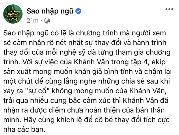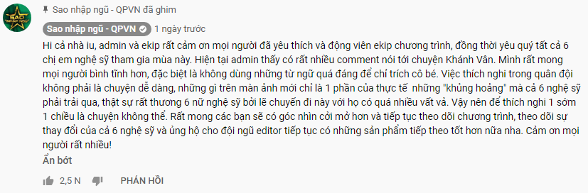 Trên fanpage chương trình, Sao Nhập Ngũ mong khán giả bình tĩnh và nhìn nhận vấn đề tích cực hơn vì mỗi nghệ sĩ sẽ dần thay đổi sau khi tham gia chương trình, đồng thời kêu gọi mọi người hãy khích lệ để Khánh Vân thay đổi.
