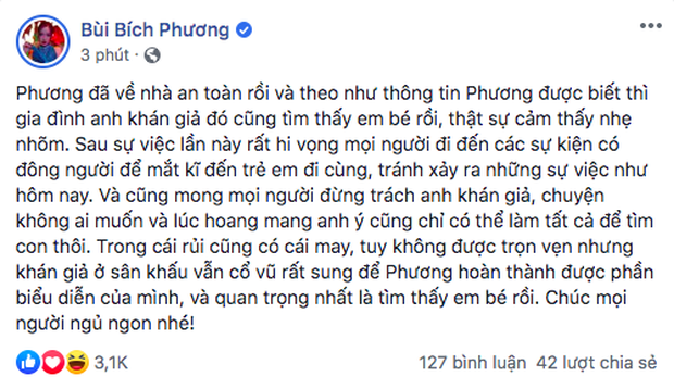 Ngay sau khi kết thúc đêm diễn, Bích Phương cũng đã lên trang cá nhân để trấn an các fan về sự an toàn của bản thân cũng như cập nhật cho khán giả biết rằng em bé đã được tìm thấy. Rất nhiều ý kiến khen ngợi Bích Phương vì đã bình tĩnh và xử lý chuyên nghiệp trước tình huống đầy bất ngờ này. Đây chắc hẳn là một trong những sự cố nhớ đời trong quá trình đi diễn của nữ ca sĩ.
