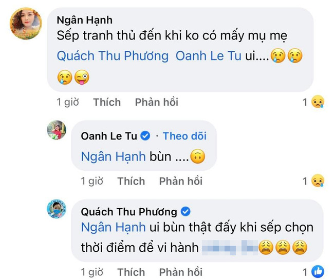 Bên dưới bài đăng của thành viên ê kíp, hội "ba bà mẹ" cũng bày tỏ sự tiếc nuối vì không có mặt khi "sếp" vi hành.
