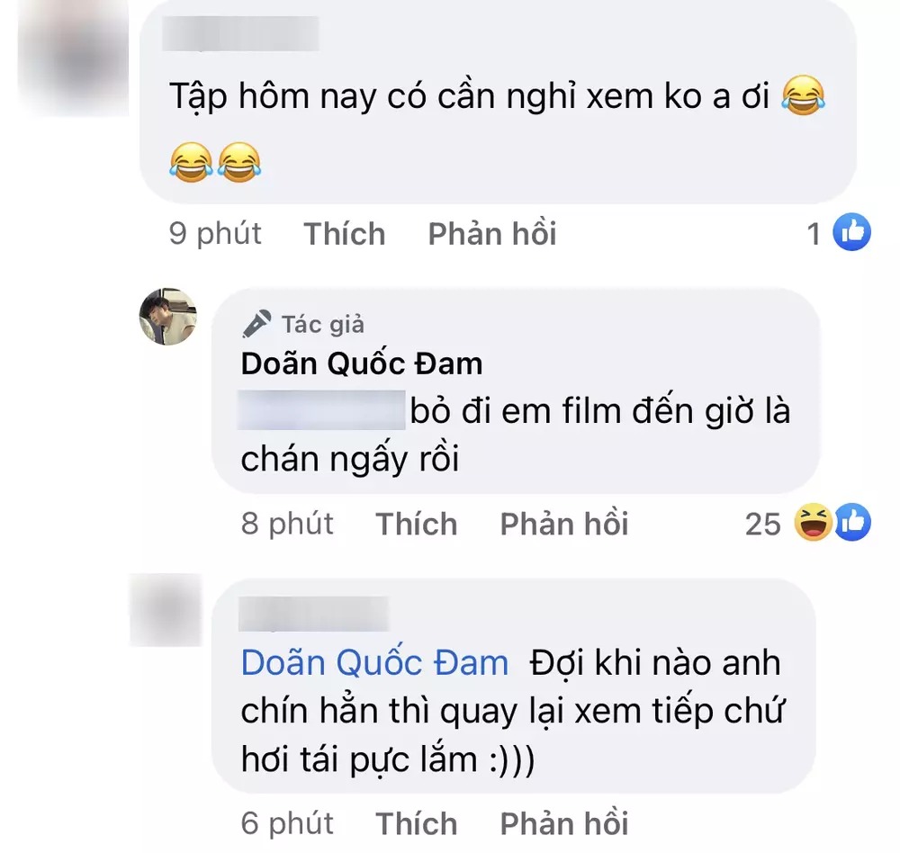 Dưới phần bình luận, cư dân mạng cũng bày tỏ sự tiếc nuối đối với tình cảnh của Phong - Vân trong phim. Khi có khán giả thắc mắc về việc có nên theo dõi tập phim mới, anh đáp: “Bỏ phim đi em, đến giờ là chán ngấy rồi.”