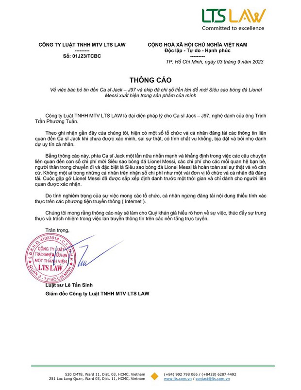 Trước đó, cũng vào sáng 3/9 cùng ngày, trên trang Facebook chính thức của công ty J97 Entertainment (công ty của Jack sáng lập) đã đăng tải thông cáo từ phía đại diện pháp lí của Jack. Thông cáo về việc bác bỏ tin đồn ca sĩ Jack - J97 đã chi số tiền lớn để mời siêu sao Lionel Messi trong sản phẩm của mình được đăng tải như sau: