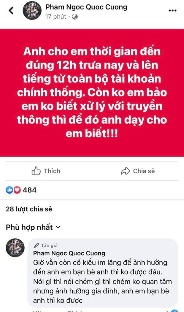 Trở lại với doanh nhân Quốc Cường, anh đã đăng tải dòng trạng thái gay gắt: "... Em không biết xử lí với truyền thông thì để đó anh dạy cho em biết...!!!".