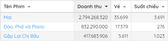 Trong khi đó, bộ phim 'Gặp lại chị bầu' do Diệu Nhi, Anh Tú đóng chính có tổng doanh thu vượt mốc 83 tỉ đồng nhưng hiện tại, doanh thu trong ngày của phim đang thua xa 'Đào, phở và piano'. Cụ thể trong ngày, phim chỉ bán được 5.611 vé, thu về 417.683.906 dù được sắp xếp đến 1.023 suất chiếu trên toàn quốc.
