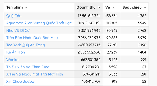 Sau tuần bùng nổ nhờ dịp Giáng sinh, phòng vé Việt tuần qua không có thêm nhiều tác phẩm quá đáng chú ý. Cuộc đua cho ngôi vị số 1 là sự tranh giành giữa Aquaman 2 và Quỷ Cẩu. Kết quả cuối cùng, bộ phim kinh dị đã chiến thắng một cách sít sao trước bom tấn siêu anh hùng của Hollywood. Dịp cuối tuần qua, Quỷ Cẩu thu 13,5 tỷ đồng, nâng tổng doanh thu phim lên múc 37,4 tỷ đồng.