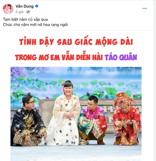 Khác với 2 nam nghệ sĩ trên, trong ngày hôm nay (29/1), nghệ sĩ Vân Dung đăng liên tiếp 2 status liên quan đến chương trình Táo Quân. Status đầu là bức hình gồm dàn Táo cũ như Tự Long, Quang Thắng, Chí Trung cùng câu quotes: "Tỉnh dậy sau giấc mộng dài. Trong mơ em vẫn diễn hài Táo Quân".