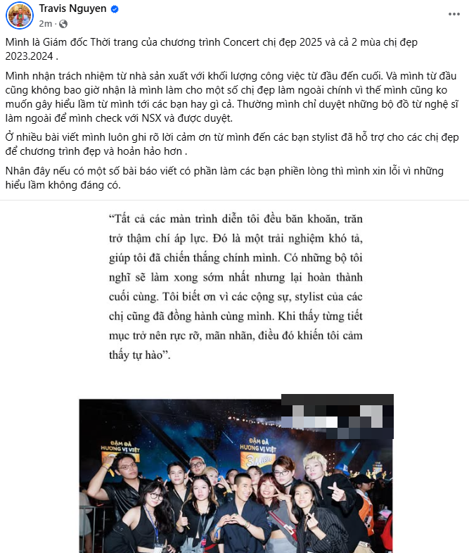Không phải 48 chị đẹp đều do anh làm, rất nhiều nghệ sĩ làm việc với stylist riêng trong đó có em là stylist chính của chị Tóc Tiên từ show cho đến concert. Hai ngày ở concer chị đẹp vừa rồi Kelbin và 2 trợ lý túc trực từ rehearsal đến ngày diễn chính và không có một sự hổ trợ nào từ Travis và team. Nói chung là việc ai nấy làm không liên quan đến nhau.