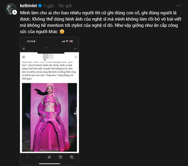 "Travis là stylist của chương trình Chị Đẹp không có nghĩa là 500 bộ đồ trong show là anh Travis làm. Có rất nhiều nghệ sĩ khác làm việc với stylist riêng điển hình như tất cả trang phục của chị Tóc Tiên là mình phụ trách..." - Kelbin Lei thể hiện quan điểm khi cảm thấy công sức của mình và đồng đội bị phủi bỏ.