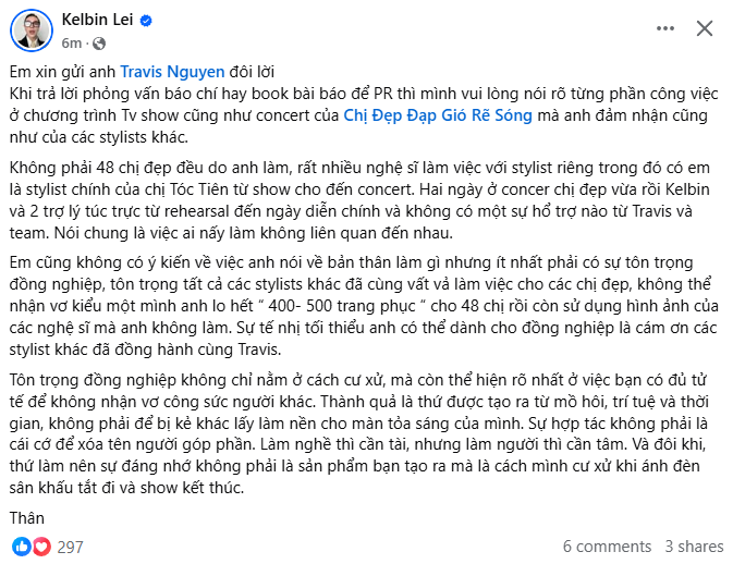 Không để Kelbin Lei và công chúng phải chờ đợi lâu, stylist Travis Nguyễn cũng ngay lập tức lên tiếng. Anh giải thích mình chưa từng "nhận vơ" công sức của người khác. Với những nghệ sĩ sử dụng ekip riêng, trách nhiệm của giám đốc thời trang là kiểm tra và làm việc lại với nhà sản xuất chương trình.