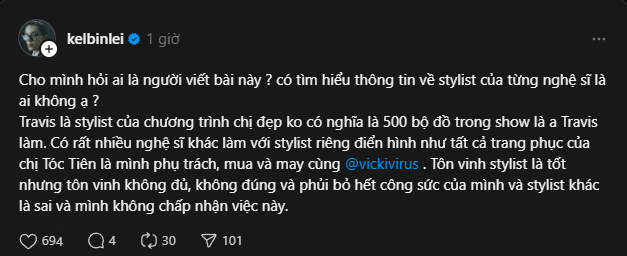 Trưa ngày 16/4, stylist Kelbin Lei bất ngờ có chia sẻ bức xúc liên quan đến giám đốc thời trang của Concert Chị Đẹp: 30 Chưa Từng Là Một Giới Hạn - stylist Travis Nguyễn. Theo đó, câu chuyện bắt đầu khi Kelbin Lei dẫn chứng bài viết của một chuyên trang thời trang có sử dụng hình ảnh của Tóc Tiên làm minh họa trong bài viết về Travis Nguyễn mà không đề cập đến đích danh của mình. Trong khi đó, Tóc Tiên chính là nghệ sĩ mà Kelbin Lei phụ trách làm hình ảnh trong dự án lần này.