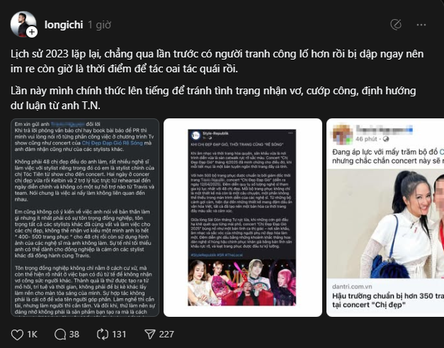 Mọi việc đến đây tưởng chừng đã ngã ngũ nhưng một stylist khác trong giới - Long Ichi là người nổ phát súng tiếp theo. Anh hiện tại cũng là stylist của các Chị Đẹp tham gia concert như Ninh Dương Lan Ngọc, Ngọc Thanh Tâm, Đồng Ánh Quỳnh. Theo đó, stylist Long Ichi lên tiếng đứng về phía người đang ở thế thiệt thòi là Kelbin Lei. Dù không nhắc đích danh Travis Nguyễn nhưng nam stylist có động thái ủng hộ Kelbin bằng cách tổng hợp các dữ kiện, đồng thời nhắc đến một chuyện cũ có liên quan mà anh gọi là "lịch sử 2023 lặp lại".