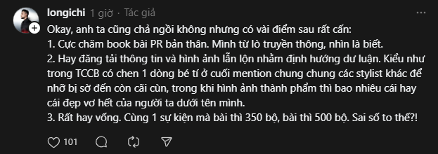 Khi trả lời phỏng vấn báo chí hay book bài báo để PR thì mình vui lòng nói rõ từng phần công việc ở chương trình Tv show cũng như concert của Chị Đẹp Đạp Gió Rẽ Sóng mà anh đảm nhận cũng như của các stylists khác.