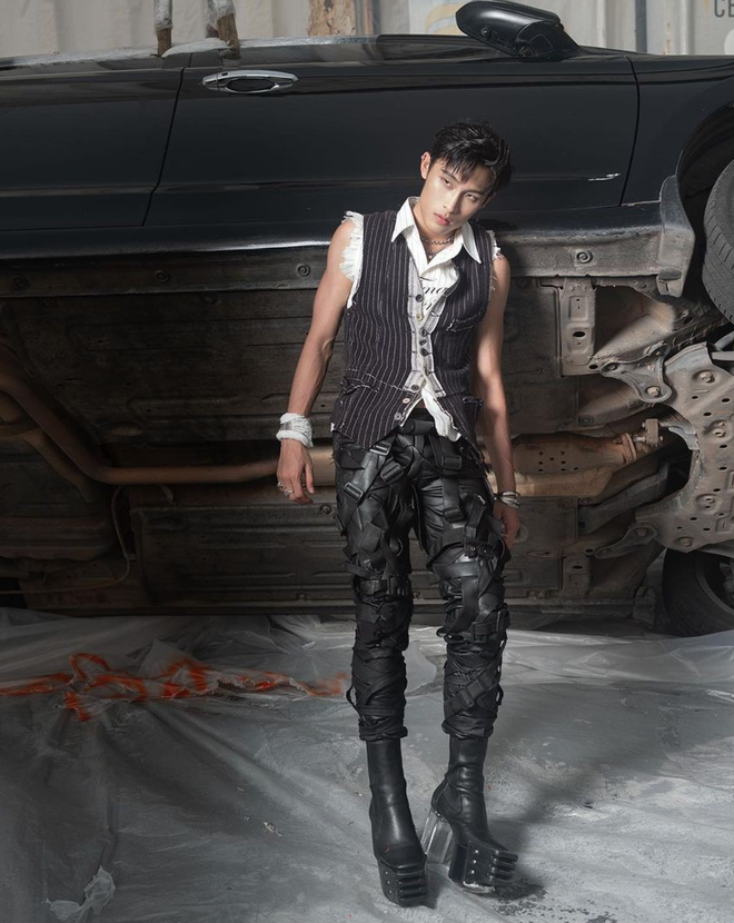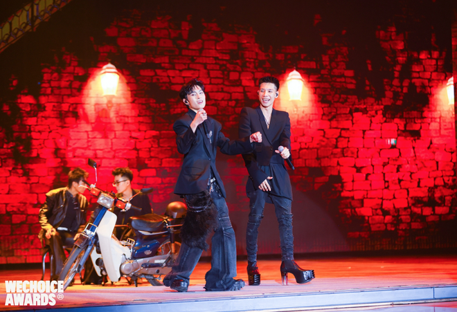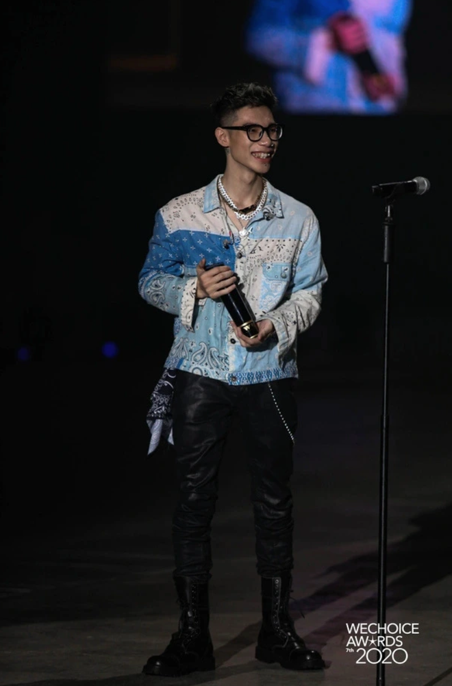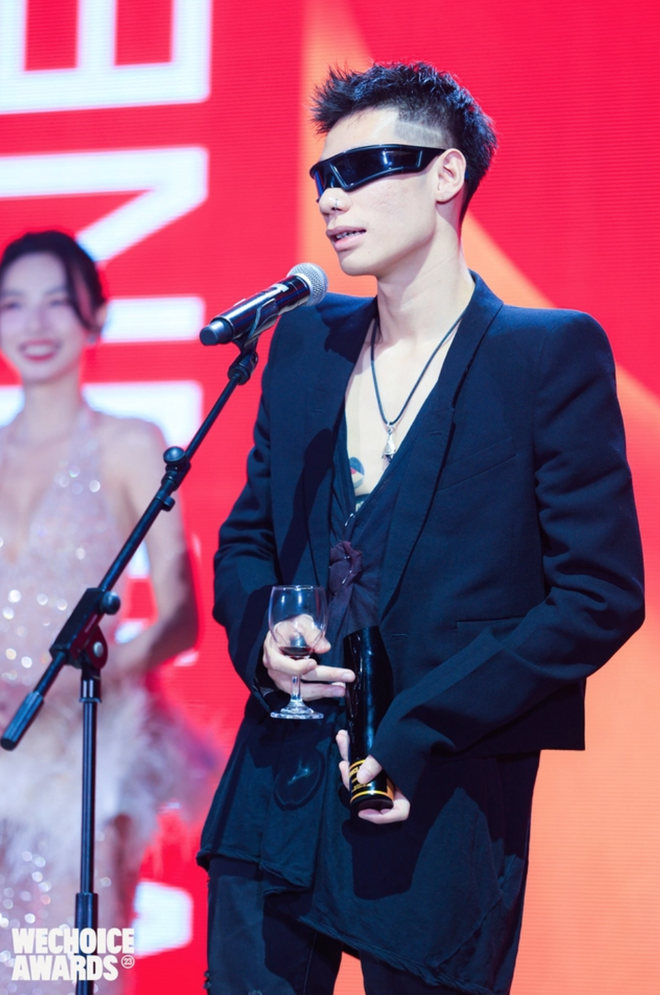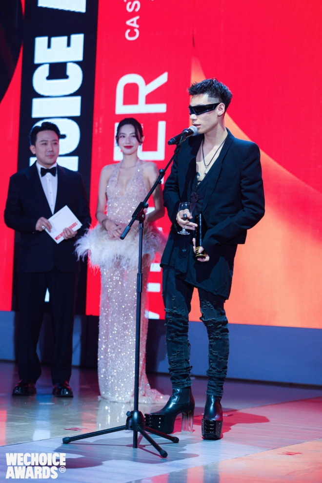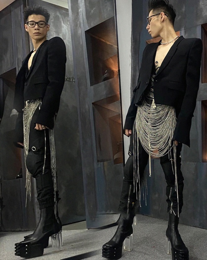 Tiếp nối liên khúc lột xác ấy, tại đêm Gala WeChoice Awards 2023, MCK tiếp tục đóng vai trò thỏi nam châm hút mọi spotlight. Điều đó không chỉ đến từ những chiếc cúp vinh danh mà anh chàng nhận được, mà còn đến từ trang phục của MCK. Đó là blazer croptop phối cùng áo thun, là quần jeans ôm sát và "chốt hạ" là đôi Grilled Platform. Không biết thế lực nào mách bảo, MCK đã lựa chọn thương hiệu Rick Owens - "chúa tể" của phong cách darkwear cho hầu hết các món trong outfit của mình.