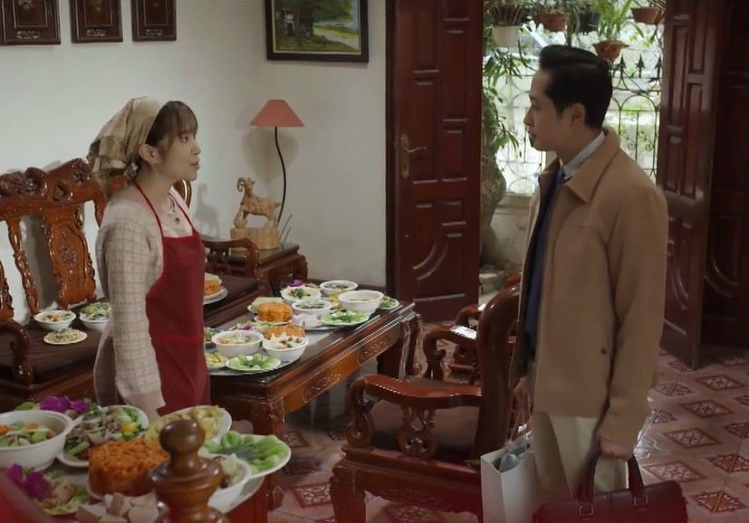 Đạt đi làm về thấy mọi thứ đã xong xuôi nên rất hài lòng. Anh còn mang quà về tặng vợ để bù đắp cho cô.