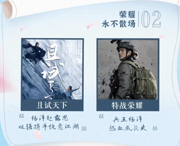Bộ phim Đặc Chiến Vinh Diệu sẽ lên sóng vào ngày 5/4 trên trang mạng Đằng Tấn. Trong khi đó, Thả Thí Thiên Hạ vẫn đã chờ lịch xếp lịch chiếu cụ thể.