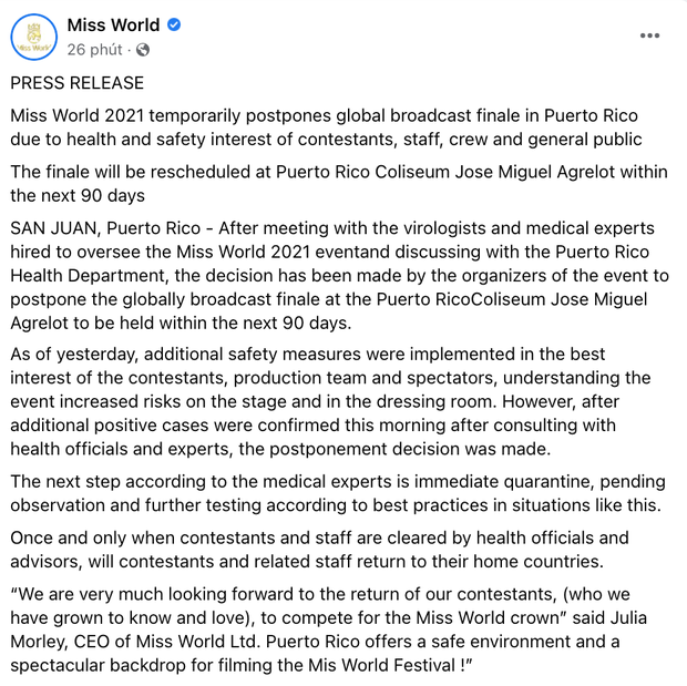 Tối muộn ngày 16/12, trang fanpage chính thức của cuộc thi Miss World đưa ra thông báo tạm hoãn tổ chức phần thi chung kết. Theo kế hoạch ban đầu, đêm chung kết Miss World 2021 sẽ diễn ra vào tối 16/12 giờ Puerto Rico tức là 6h sáng ngày 17/12 theo giờ Việt Nam.