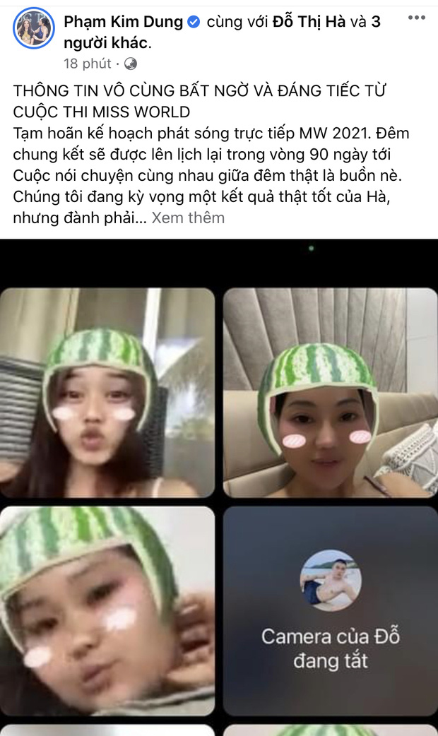 Chia sẻ trên trang cá nhân, đại diện Việt Nam tại Miss World 2021 Hoa hậu Đỗ Thị Hà viết: "Sau khi ghi nhận nhiều ca nhiễm Covid-19 từ các thí sinh lẫn nhân viên trong ekip làm việc, mới đây Miss World đã ra thông báo tạm hoãn kế hoạch phát sóng trực tiếp Miss World 2021. Đêm chung kết sẽ được lên lịch lại trong vòng 90 ngày tới. Đây là thời điểm chưa đủ an toàn để tổ chức đêm chung kết nên bắt buộc phải hoãn lại. Thí sinh và khán giả cũng có một chút tiếc nuối cho hành trình này nhưng chúng ta nên hiểu rằng sức khoẻ phải được ưu tiên hàng đầu nha mọi người”.