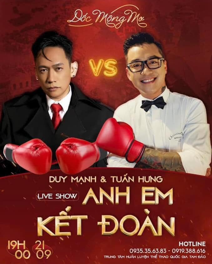 Mới đây, “thợ hát” Duy Mạnh tiếp tục khuấy động không khí của đêm nhạc kết hợp giữa anh và Tuấn Hưng sắp tới. Lần này, “thợ hát” nhất quyết “dí” cho bằng được MC Phan Anh sẽ xuất hiện để dẫn chương trình cho cả 2. Đi kèm với đó là tấm ảnh chế poster hài hước về đêm nhạc Anh Em Kết Đoàn mô tả Duy Mạnh và Tuấn Hưng là… 2 võ sĩ boxing chuẩn bị thượng đài để “đấm” nhau.