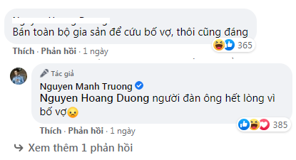 Ngay sau đó, đại diện truyền thông phim "Hương vị tình thân" cảm thán dưới bài đăng của diễn viên Mạnh Trường: "Bán cả gia sản để cứu bố vợ, thôi cũng đáng." Mạnh Trường cũng tung hứng nhiệt tình: "Người đàn ông hết lòng vì bố vợ".