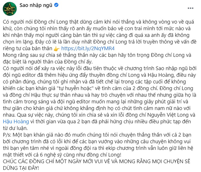 Theo đó, ekip thừa nhận đã thêm thắt hiệu ứng để đẩy thuyền cho cả hai: "Có người nói để xảy ra việc này lỗi đầu tiên thuộc về chương trình Sao nhập ngũ bởi đội ngũ editor đã thêm hiệu ứng đẩy thuyền đồng chí Long và Hậu Hoàng. Điều này có phần đúng, chúng tôi ghi nhận và đã tiết chế lại trong các tập cuối để không khiến các bạn khán giả tự huyễn hoặc về tình cảm của 2 đồng chí. Đồng chí Long và đồng chí Hậu thực sự thân nhau và hay trò chuyện với nhau thế nhưng giữa họ là tình cảm trong sáng và đội ngũ editor muốn mang lại những giây phút giải trí và thư giãn cho khán giả chứ không khẳng định họ có chút tình cảm nam nữ nào với nhau".