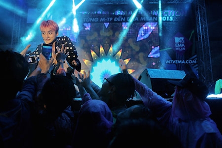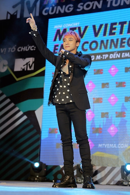 Sơn Tùng trong đêm mini concert tại Nhà văn hóa Thanh Niên (TP.HCM) hôm 11/10 để kêu gọi fan ủng hộ trong cuộc đua EMA 2015 |