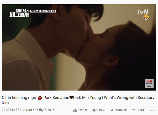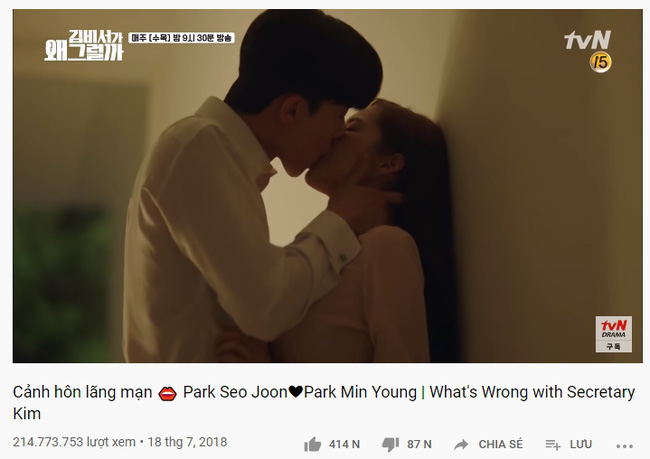 Bên cạnh đó, clip tình ái nóng bỏng giữa Park Seo Joon và Park Min Young trong Thư ký Kim sao thế? còn nhận được hơn 425.000 lượt thích trên YouTube. Video này cũng nhận về hàng ngàn bình luận từ fan khắp nơi trên thế giới.