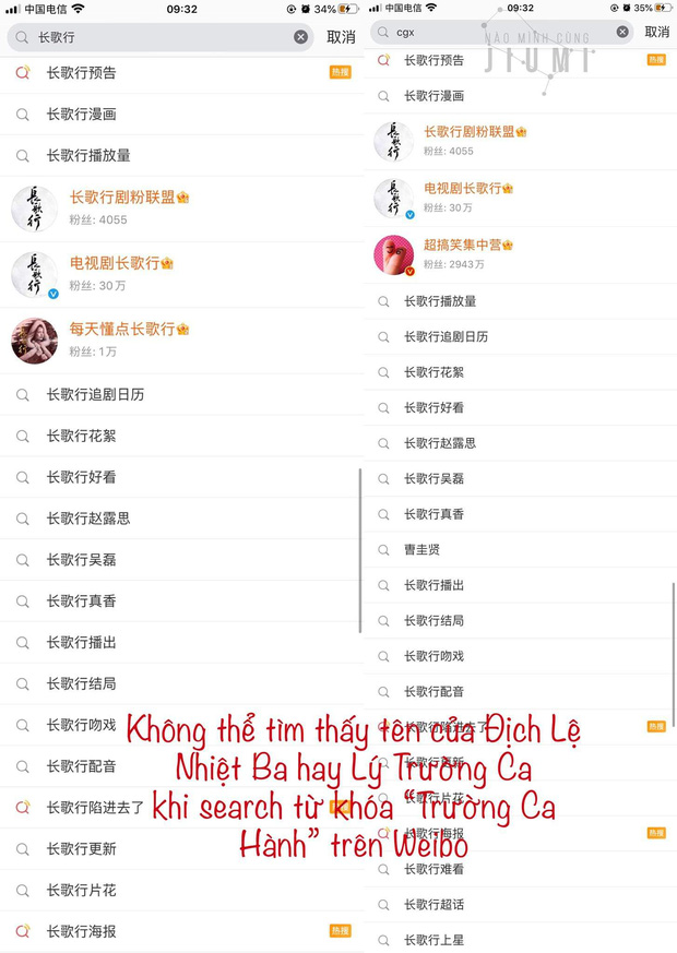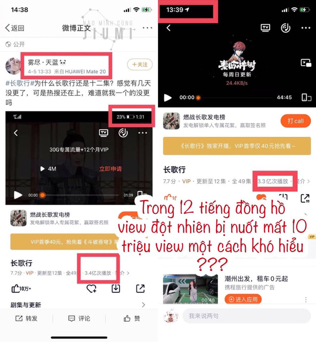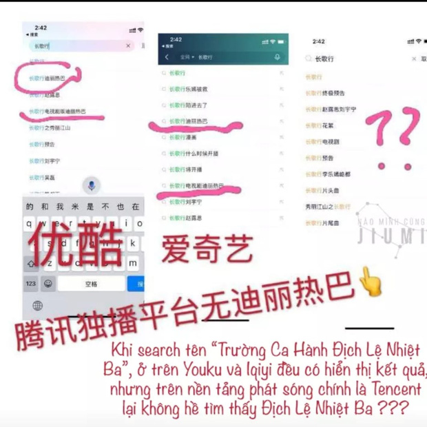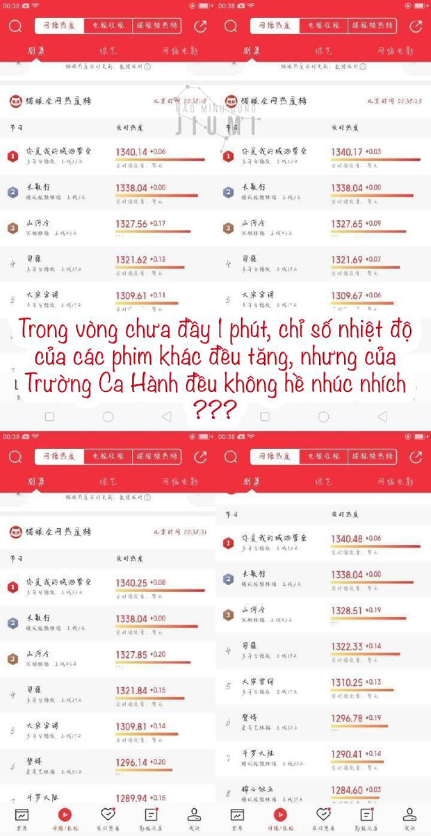 - Ừ thì chiếu trên Cụt nhưng của Hoa Sách sản xuất. Bị Tra Lãng (Weibo) đè nhiệt, Hot search bị đè không cho lên trong khi lượt tương tác cao hơn Top 10. Bị Tra Lãng trừ tương tác, Tencent ém view, bị Tencent xoá bình luận, vào trang chủ Tencent tìm kím Trường Ca Hành lại ra dàn diễn viên phụ, diễn viên chính ra chuồng gà.