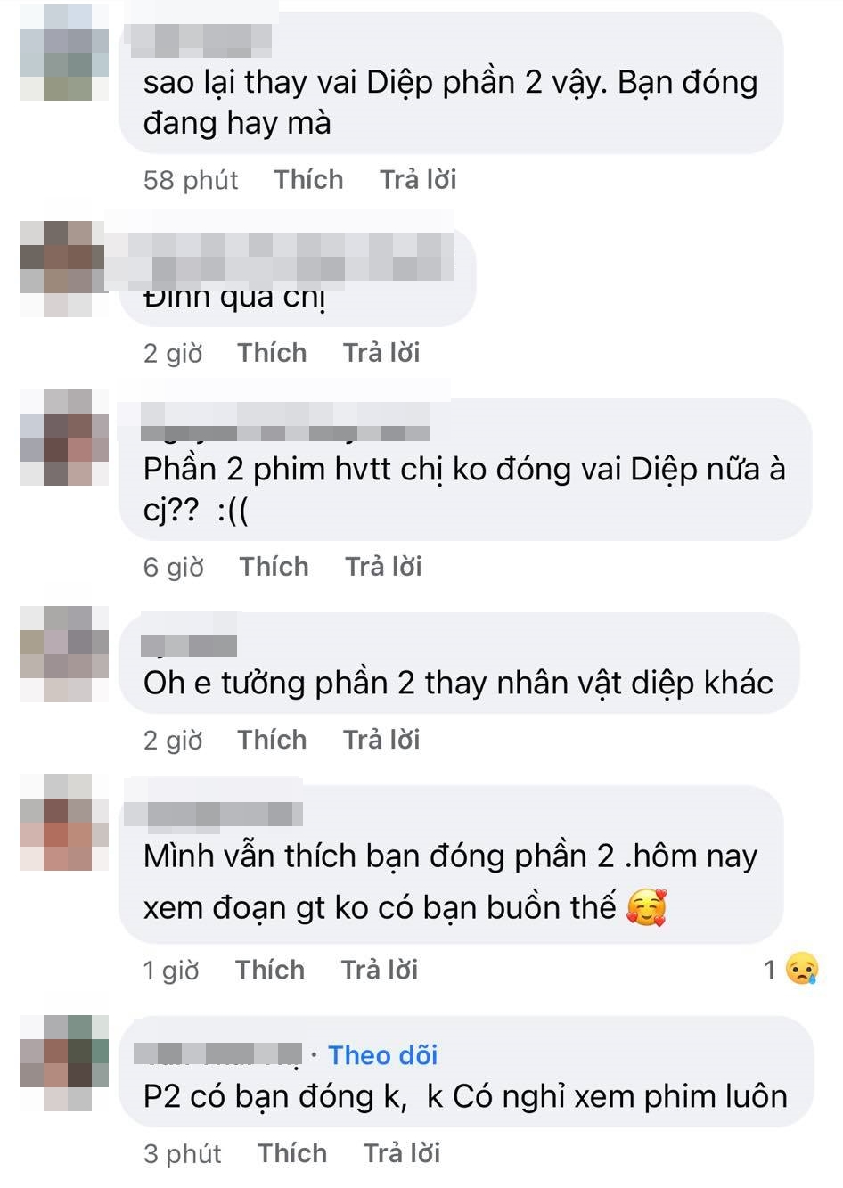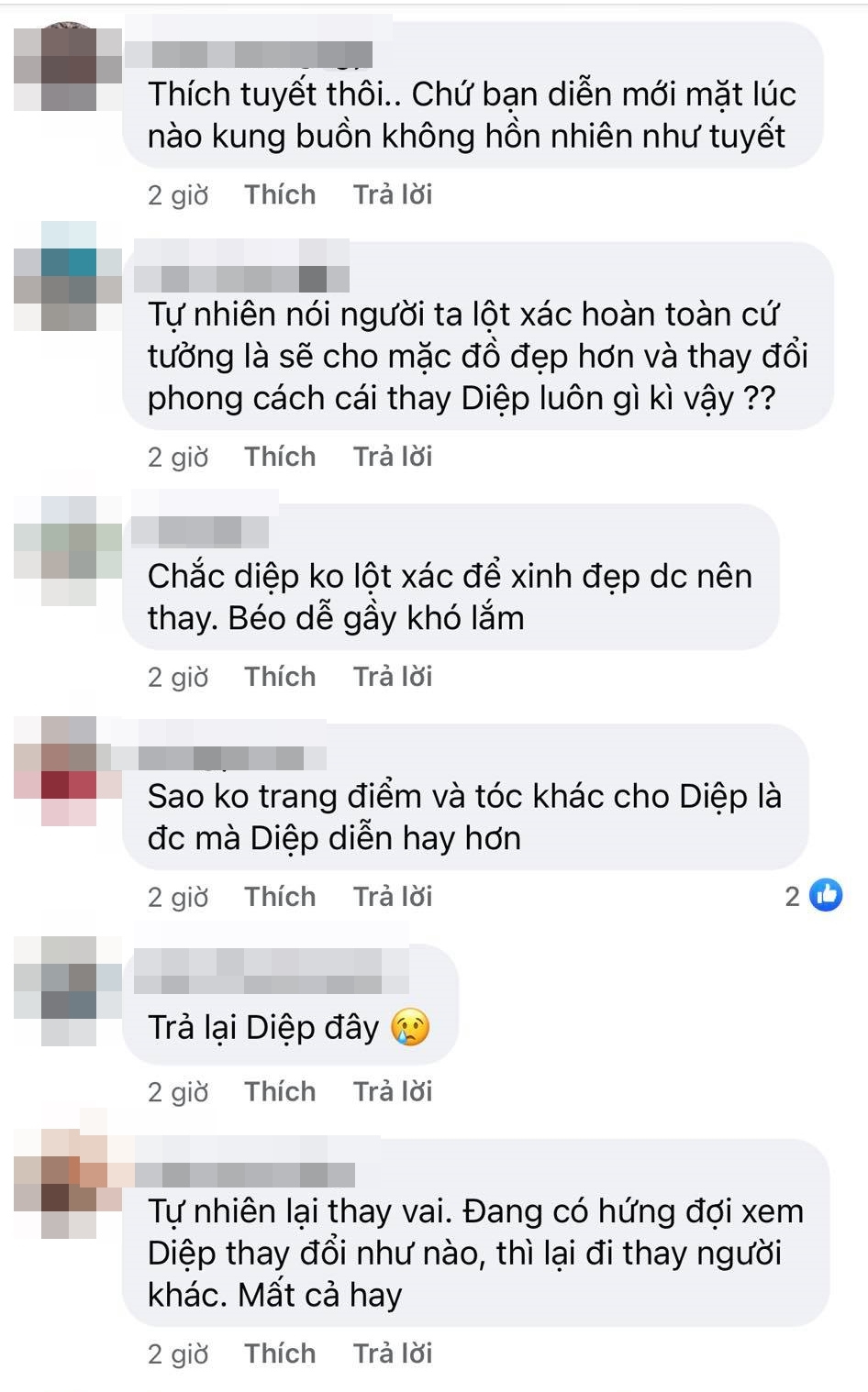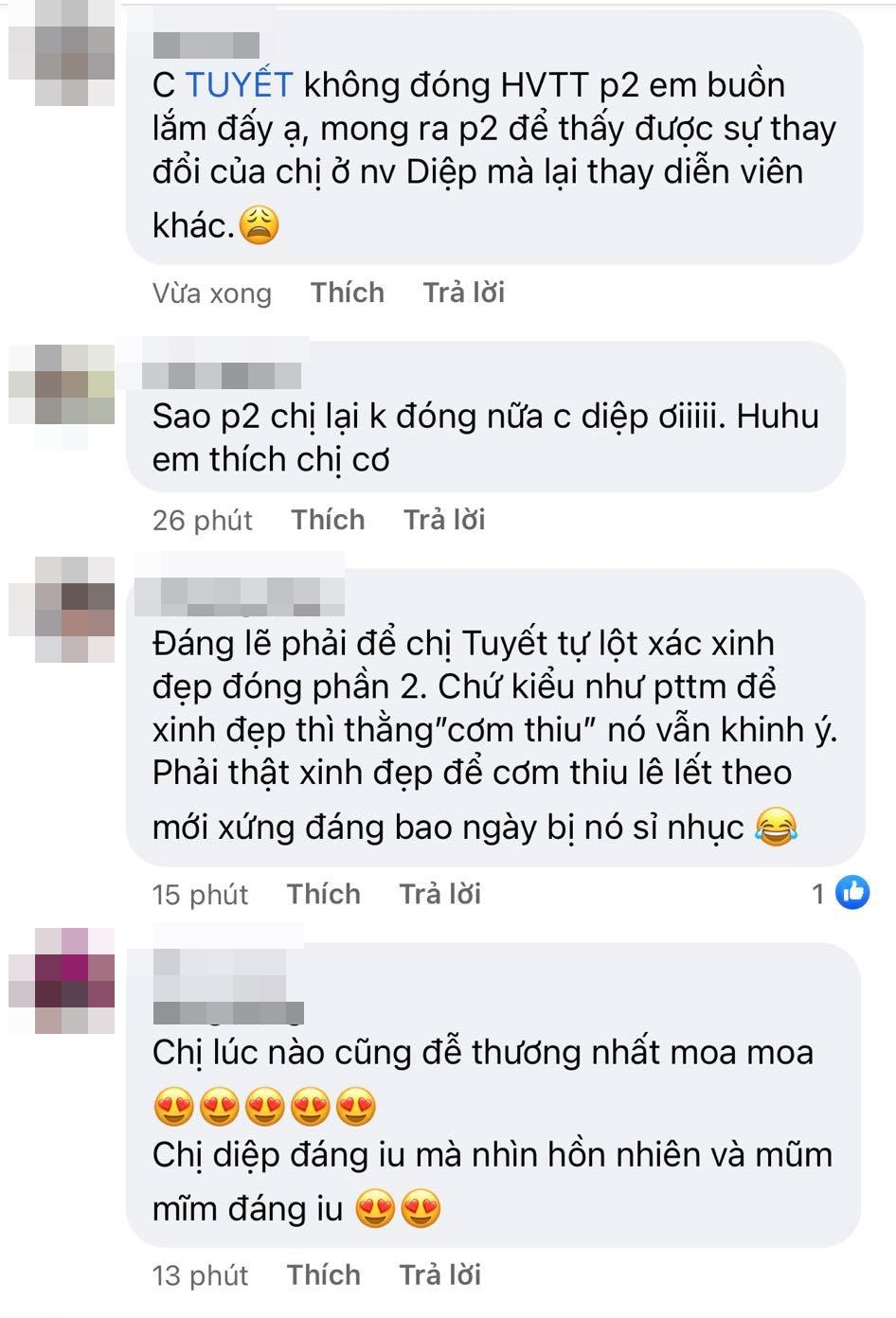 Bên cạnh đó, số đông người xem đều tỏ ra không hài lòng với quyết định thay vai này vì cho rằng việc thay vai sẽ khiến cảm xúc xem phim không còn "ép phê" nữa, ngay cả là với một vai phụ như Diệp. Bởi so với việc bỗng dưng xuất hiện với một diện mạo mới, thì việc nỗ lực thay đổi trên nền tảng vốn có của mình sẽ khiến câu chuyện trở nên ý nghĩa hơn.