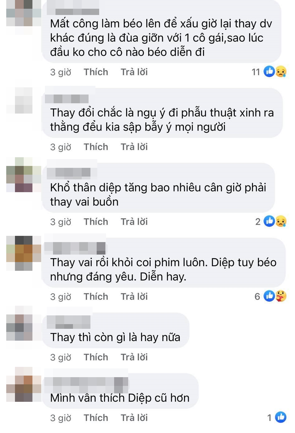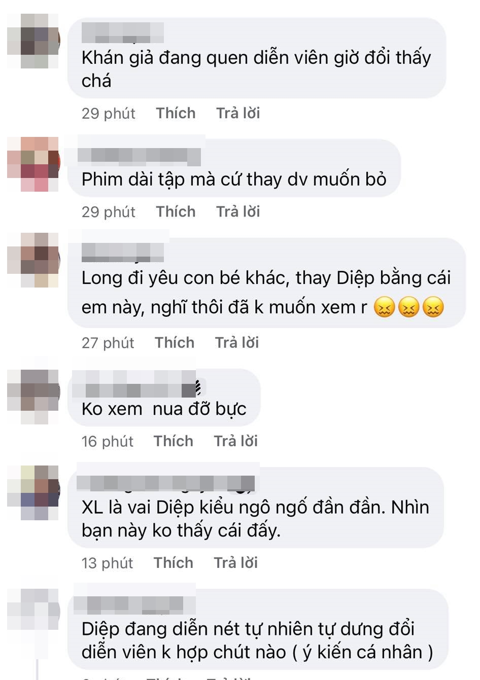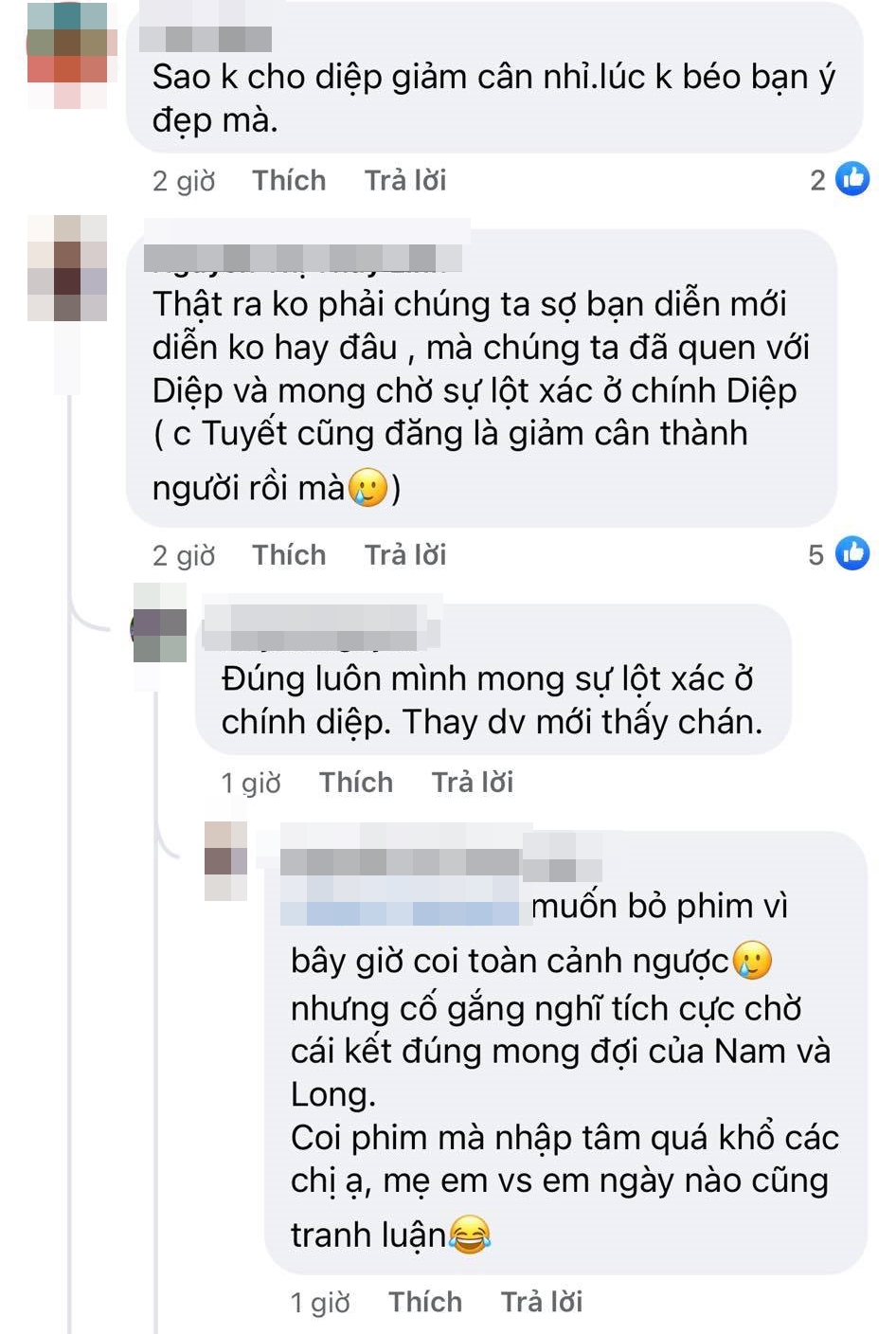 Bên cạnh đó, số đông người xem đều tỏ ra không hài lòng với quyết định thay vai này vì cho rằng việc thay vai sẽ khiến cảm xúc xem phim không còn "ép phê" nữa, ngay cả là với một vai phụ như Diệp. Bởi so với việc bỗng dưng xuất hiện với một diện mạo mới, thì việc nỗ lực thay đổi trên nền tảng vốn có của mình sẽ khiến câu chuyện trở nên ý nghĩa hơn.