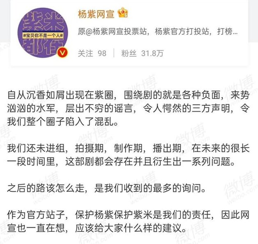 Để tỏ ra thái độ trước sau như một của mình, mới đây, trạm fan lớn của Dương Tử đã tuyên bố sẽ không tiến hành bất cứ hành động quảng bá nào cho bộ phim Trầm vụn hương phai dù rằng thần tượng của họ có là nữ chính đi chăng nữa. Họ bày tỏ sẽ không xem cũng như chẳng cày số liệu giúp cho Dương Tử về dự án này.