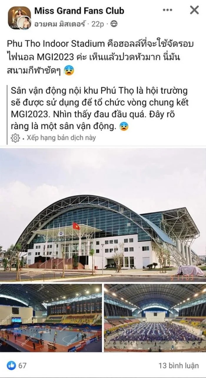 Tuy nhiên, fan sắc đẹp Thái Lan bỗng đăng bài phàn nàn về địa điểm tổ chức tại Việt Nam. Họ cho rằng Nhà thi đấu Phú Thọ không đủ "tầm" để làm nơi diễn ra Miss Grand International 2023. Dưới phần bình luận, nhiều người mong cuộc thi sẽ được tổ chức tại nơi tầm cỡ và phải có điều hòa trong ngày hè nóng bức. Thậm chí, những khán giả này còn cho rằng Việt Nam không có nơi đủ lớn để tổ chức cuộc thi.
