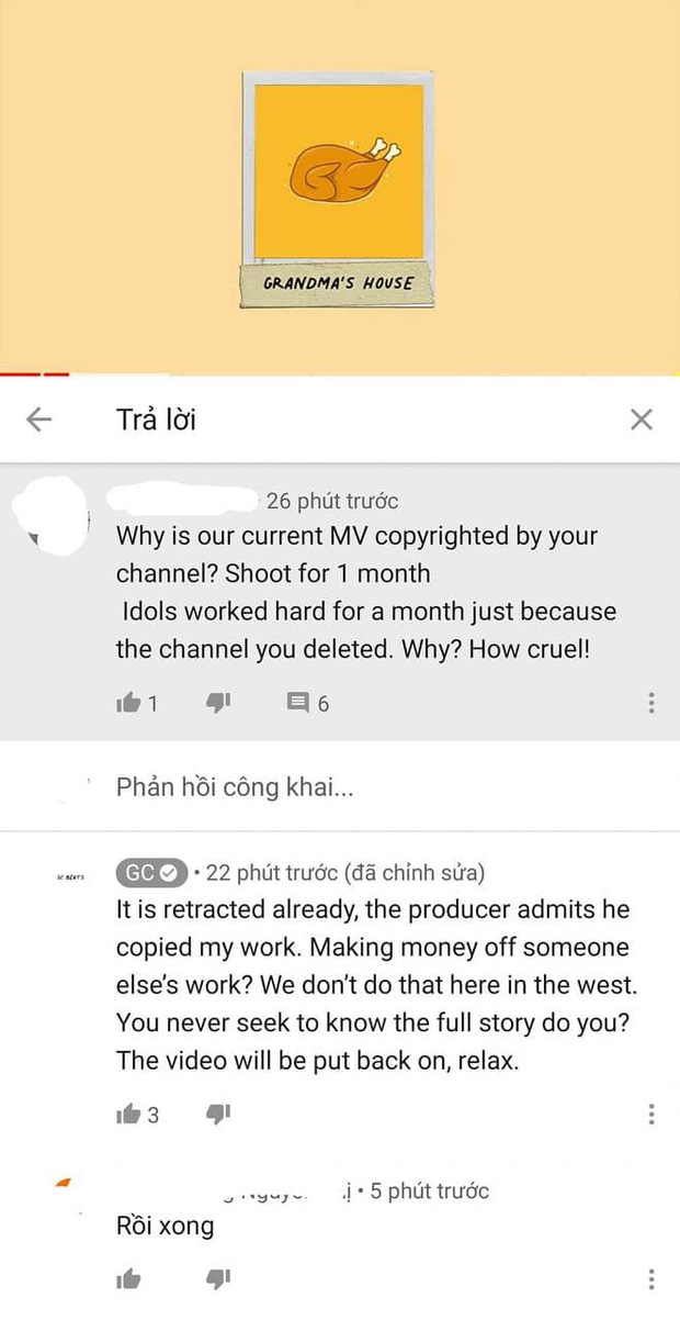 Ở một diễn biến khác, trên một đoạn beat khác cùng kênh GC đăng tải, đơn vị sản xuất âm nhạc này đã lập tức có phản hồi đầu tiên. Theo đó, khi có người hâm mộ hỏi: "Vì sao bạn lại đánh bản quyền MV của thần tượng chúng tôi? MV được quay trong cả 1 tháng trời, anh ấy cũng làm việc rất chăm chỉ để rồi bạn xoá như vậy. Thật độc ác!".