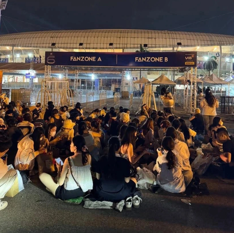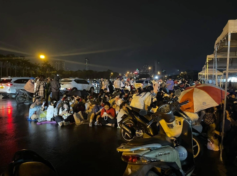 Dù cổng check-in chỉ chính thức mở vào 12h trưa 10/5, khu vực xung quanh sân vận động Mỹ Đình đã trở nên nhộn nhịp từ đêm hôm trước. Nhiều khán giả trẻ mang theo áo mưa, chiếu, chăn và đồ ăn nhẹ, thậm chí nằm tạm ngoài trời để giữ chỗ gần sân khấu