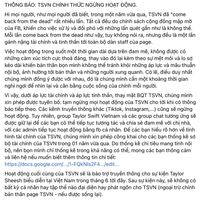 Đêm ngày 29/5, một tài khoản được cho là quản trị viên của TSVN (viết tắt của Taylor Swift Việt Nam) - một trong những fanpage của nữ ca sĩ Taylor Swift tại Việt Nam đã tuyên bố chính thức ngừng hoạt động. Điều đáng chú ý là fanpage này đăng thông báo không lâu sau loạt tin Taylor Sheesh - phiên bản đúp Philippines cũng công bố lịch trình đến Việt Nam.