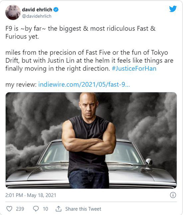 Đồng thời, Han Lue (Sung Kang) cũng trở lại sau khi bất ngờ bỏ mạng bởi màn trả thù của Deckard Shaw (Jason Statham) ở Tokyo. Sau nhiều lần trì hoãn vì Covid-19, Fast & Furious 9 sẽ chính thức ra rạp vào tháng 6 năm nay. Tuy nhiên một số nhà phê bình phim ở Mỹ đã có cơ hội xem trước bộ phim và không tiếc lời khen ngợi tính giải trí của tác phẩm.