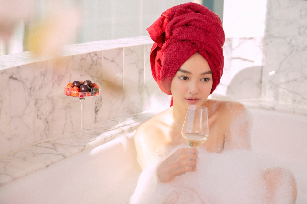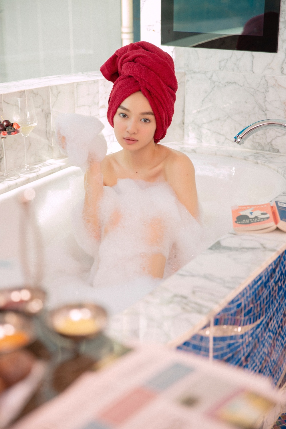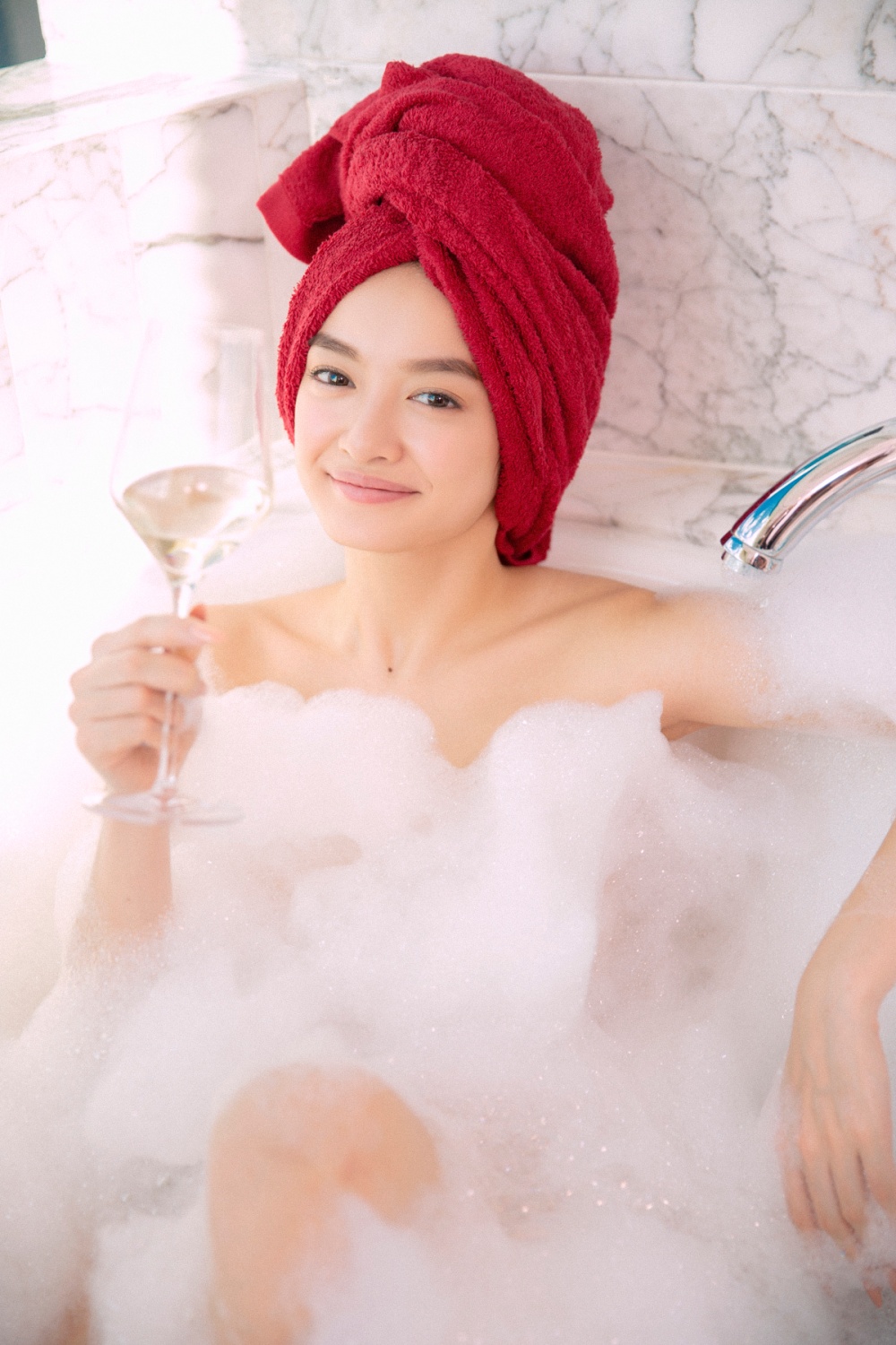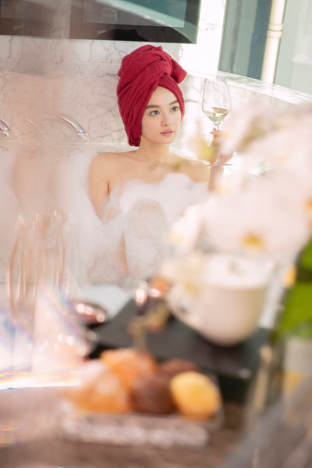 Trong lớp bọt xà phòng, Kaity Nguyễn bán nude, khoe trọn vóc dáng gợi cảm với làn da trắng hồng. Bên cạnh đó nhan sắc mỹ miều, đôi môi mọng đỏ cực kỳ quyến rũ của Kaity Nguyễn như làm bừng sáng cả khung hình. Đây là lần hiếm hoi Kaity Nguyễn thực hiện cảnh tắm bán nude trong phim.