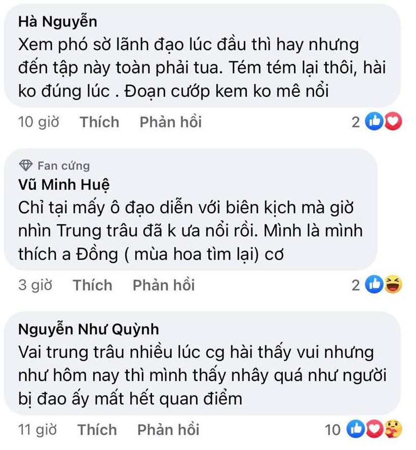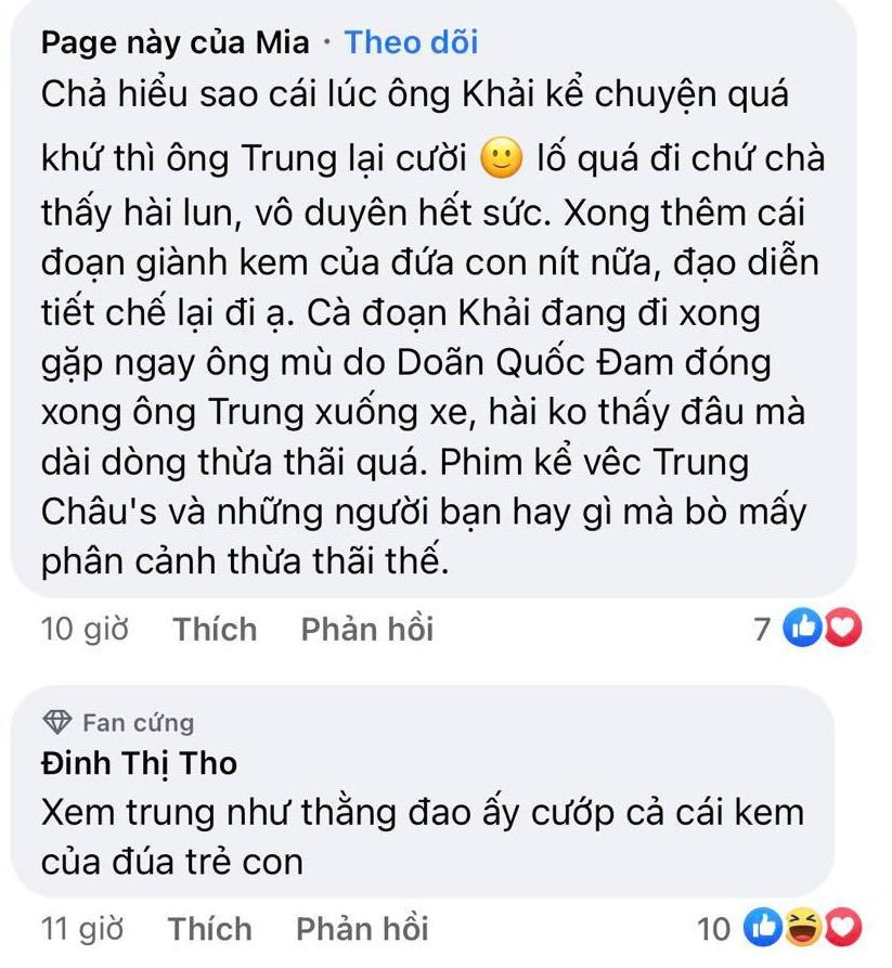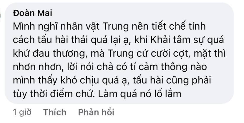 Cảnh phim hé lộ quá khứ của hai anh em Khải - Vân khiến nhiều khán giả rơi nước mắt. Tuy nhiên, Trung lại tỏ ra chẳng chút thương cảm, thậm chí bật cười như nghe một câu chuyện hài. Điều này khiến khán giả vô cùng khó chịu. Người xem cho rằng biên kịch, đạo diễn đang khiến nhân vật Trung 'trâu' ngày càng mất đi sức hút, sự duyên dáng ban đầu vì cố tình nhồi nhét mảng miếng hài đôi khi kiên cưỡng gây ức chế.