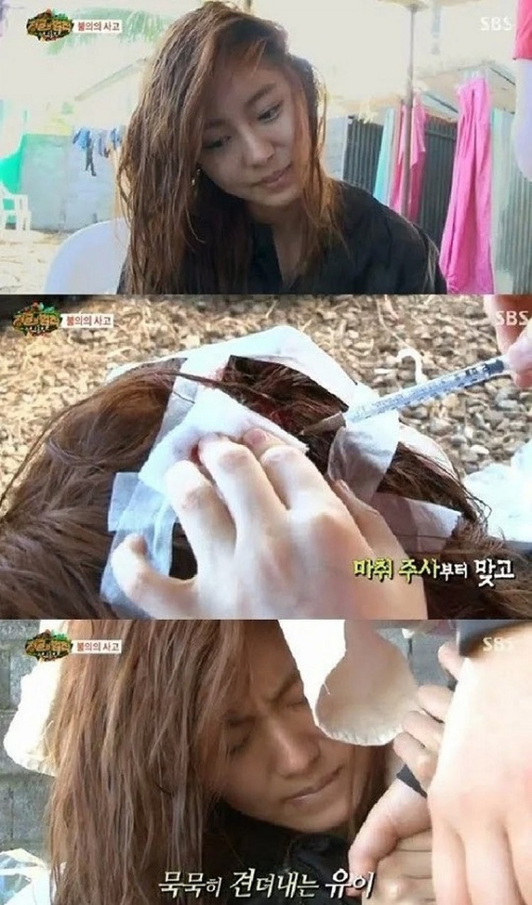 Thật sự chương trình Law Of The Jungle không phải là nơi dành cho những thần tượng yếu ớt. Trong một tập năm 2014, UEE đã bị sóng từ biển hất văng xuống mỏm đá dẫn đến bị thương ở đầu và phải khâu nhiều mũi. May mắn là nó không để lại di chứng với UEE.