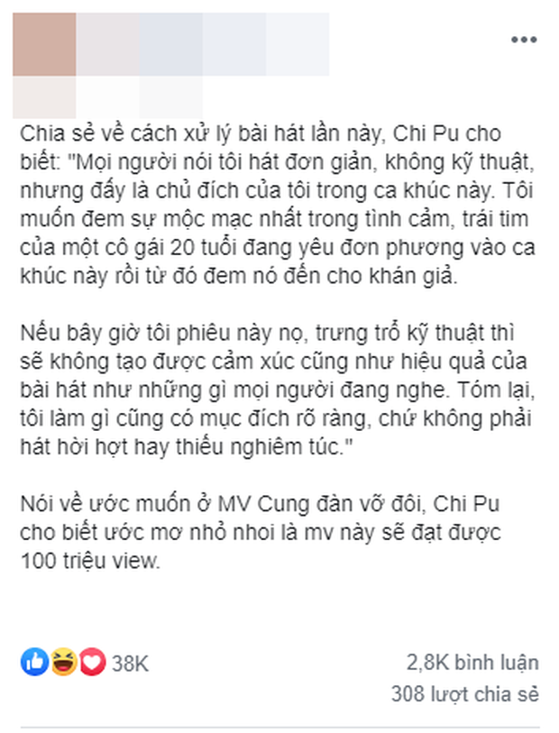 "Nếu bây giờ tôi phiêu này nọ, trưng trổ kỹ thuật thì sẽ không tạo được cảm xúc cũng như hiệu quả của bài hát như những gì mọi người đang nghe. Tóm lại, tôi làm gì cũng có mục đích rõ ràng, chứ không phải hát hời hợt hay thiếu nghiêm túc. Nói về ước muốn ở MV Cung đàn vỡ đôi, Chi Pu cho biết ước mơ nhỏ nhoi là MV này sẽ đạt được 100 triệu view".