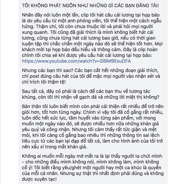 Ngoài ra, nữ ca sĩ cũng chia sẻ: "Bản thân Chi luôn biết mình còn phải cải thiện rất nhiều để trở nên giỏi hơn, tốt hơn từng ngày. Chính vì vậy Chi đã cố gắng rất nhiều, luôn dốc hết sức lực, tâm huyết vào từng sản phẩm, với mong muốn một ngày nào đó, sẽ được nhiều hơn nữa những khán giả yêu quý và công nhận. Nhưng Chi cảm thấy rất tức giận, mệt mỏi và uất ức khi càng cố gắng bao nhiêu thì những thông tin sai lệch tiêu cực từ họ và từ trên mạng lại đạp đổ tất cả, làm cho hình ảnh của Chi trở nên xấu xí trong mắt khán giả. Không ai muốn nỗ lực để mỗi ngày thức dậy là lại thấy mình bị người ta chửi rủa - Cho những điều mình không nói, mình không làm, mình không cố ý. Nếu bạn là Chi, bạn mới thấm hết cái đau đến uất nghẹn đó".