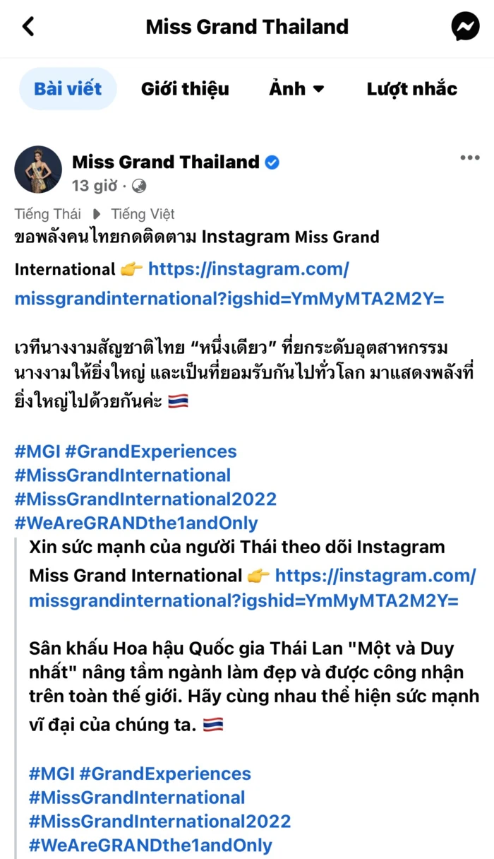 Đồng thời, Engfa Waraha cũng chia sẻ lại bài viết này của Miss Grand Thailand trên trang cá nhân có 1,2 triệu người theo dõi của mình để "cứu vớt" được sự suy giảm lượng follow của tổ chức Miss Grand International.