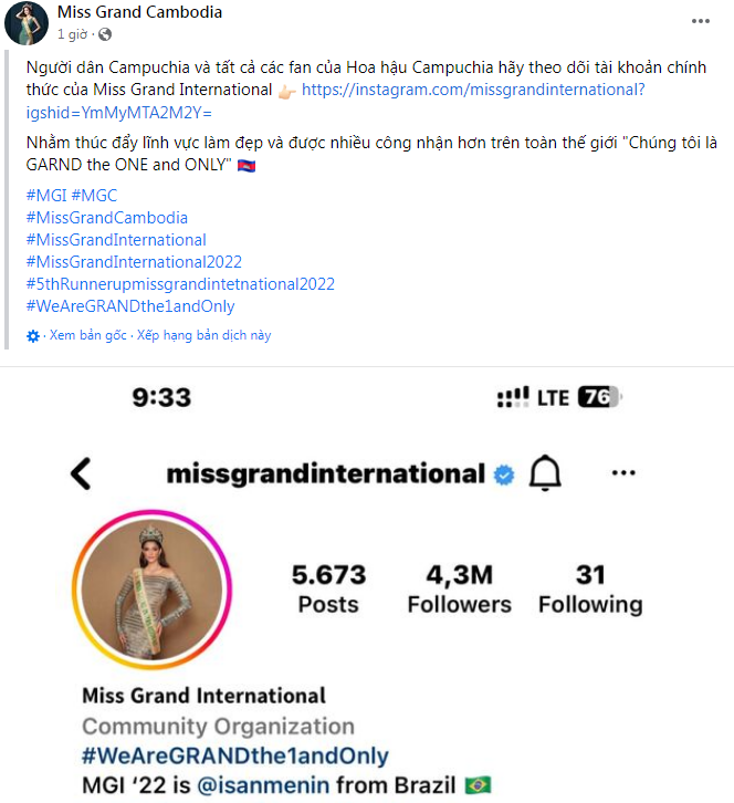 Bên cạnh đó, cộng đồng fan Campuchia cũng được lôi vào cuộc. Trang chủ Miss Grand Cambodia cũng đứng dậy để kêu gọi người dân trong nước ấn nút follow.