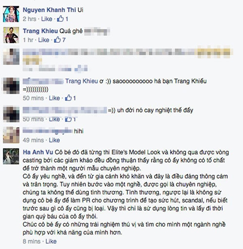 "Cô bé đó đã từng thi Elite's Model Look và không qua được vòng casting bởi các giám khảo đều đồng thuận thấy rằng cô ấy không có tố chất để trở thành một người mẫu chuyên nghiệp.